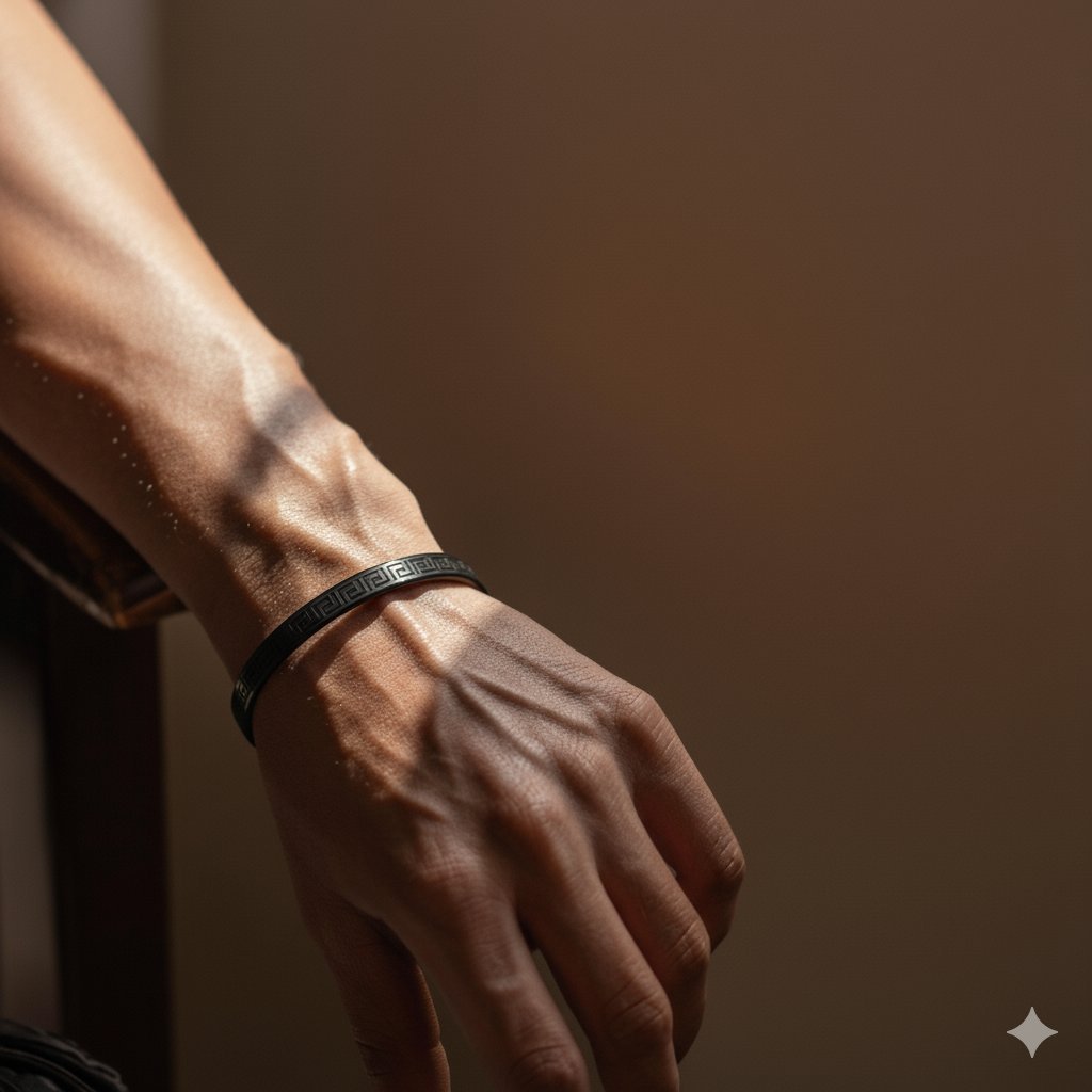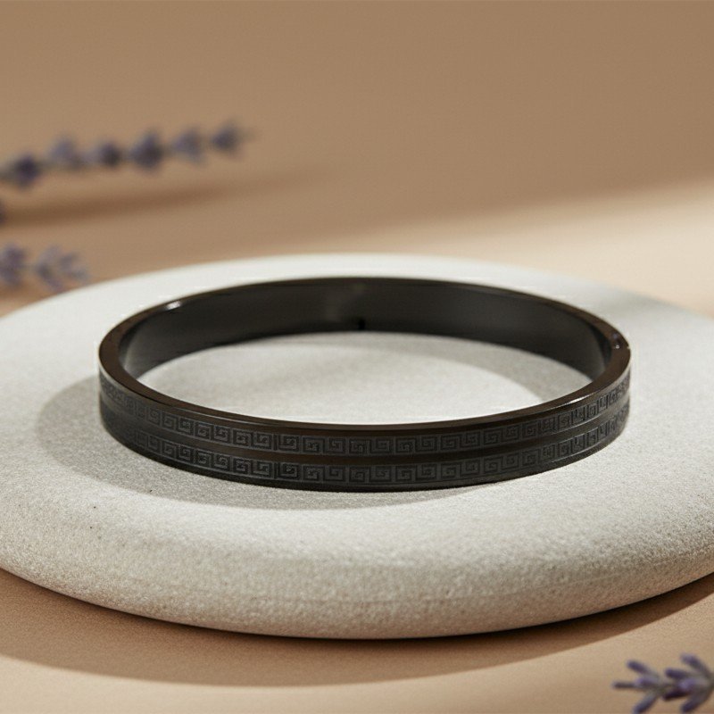 This collection features sleek, minimalist cuff bracelets designed for the modern man. Each piece is crafted from durable, highly polished or matte-finished metal, with a secure hinge or opening mechanism for easy wear. The bangles share a bold, substantial width that makes them perfect for wearing alone as a statement piece or stacking with a watch. The finishes range from classic, unadorned black and rose gold to subtle, engraved patterns like geometric keys and woven textures, offering a contemporary edge to any outfit.