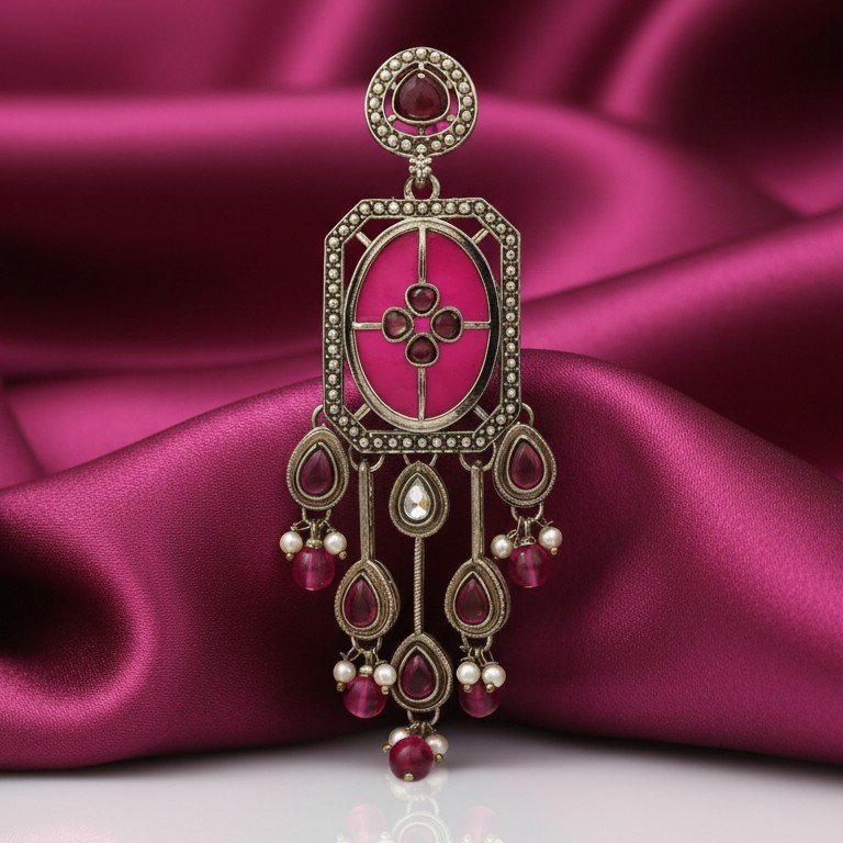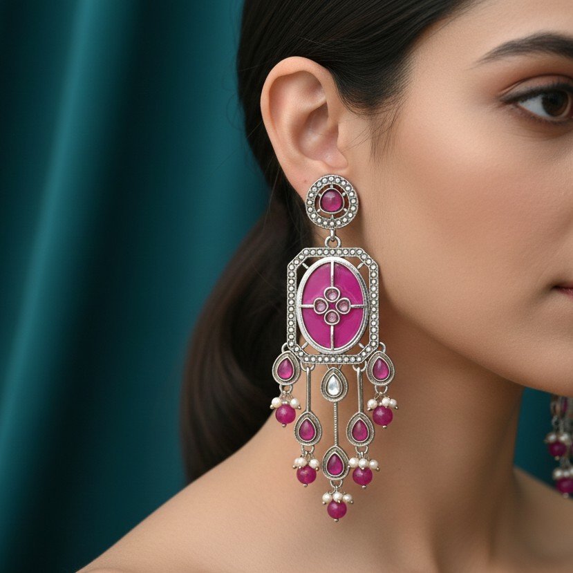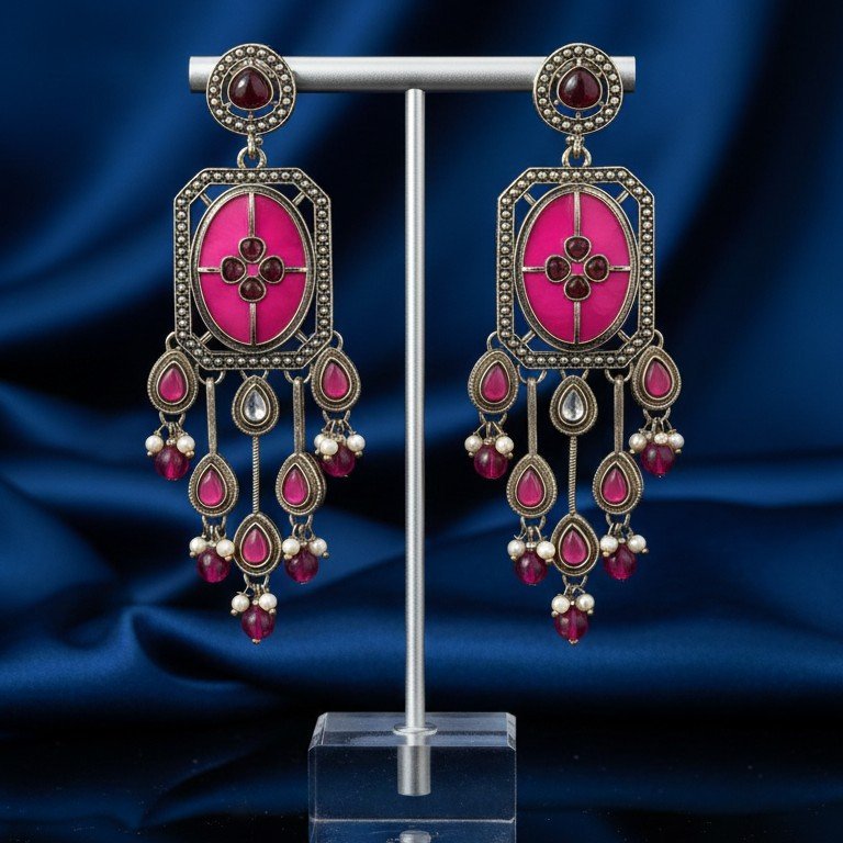 A striking fusion of heritage craftsmanship and modern design, the Royal Bloom Pink Dangler Jhumka is made to own the spotlight. The vibrant pink enamel centrepiece anchors the design, surrounded by antique-inspired silver detailing that adds depth and texture. Multi-tiered drops move with every step, creating a soft rhythmic shimmer that catches attention from every angle. Lightweight yet bold, this statement pair complements festive outfits, contemporary ethnicwear, and elevated evening looks. Designed to last, these earrings bring versatility and cultural elegance into one powerful accessory. If you love jewellery that speaks before you do, this jhumka is your match — timeless, confident, unmistakably Unblock Collection.
